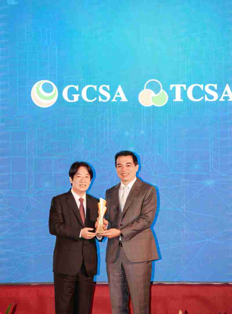 达全方位永续表现获全球永续奖及台湾永续奖肯定,,,,由副总统赖清德颁奖 (左),,至成国际总经理柯富仁 (右) 代表领奖
