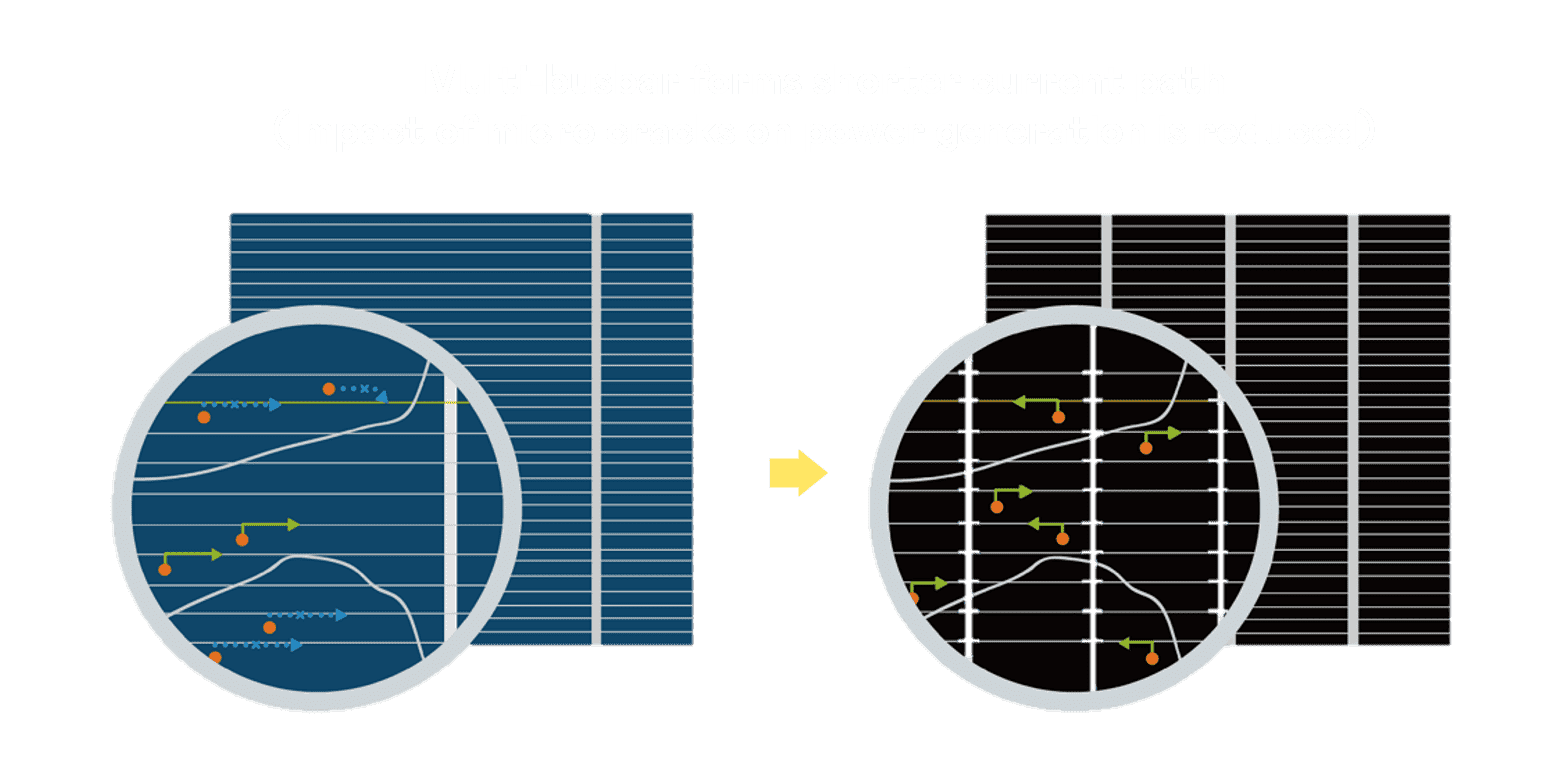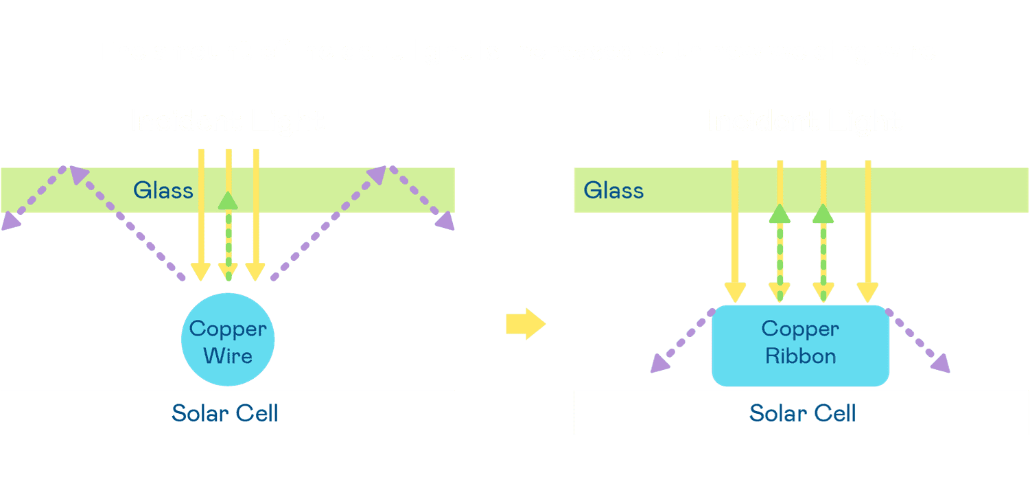 - 电池使用多条铜导线 (Copper wire) 于电池片上形成较短的电流路径,,,提高电流收集效率,,采用圆形设计的铜导线较传统扁平式的铜焊带 (Ribbon),,,,可增加入射至电池的光线量。。。。
