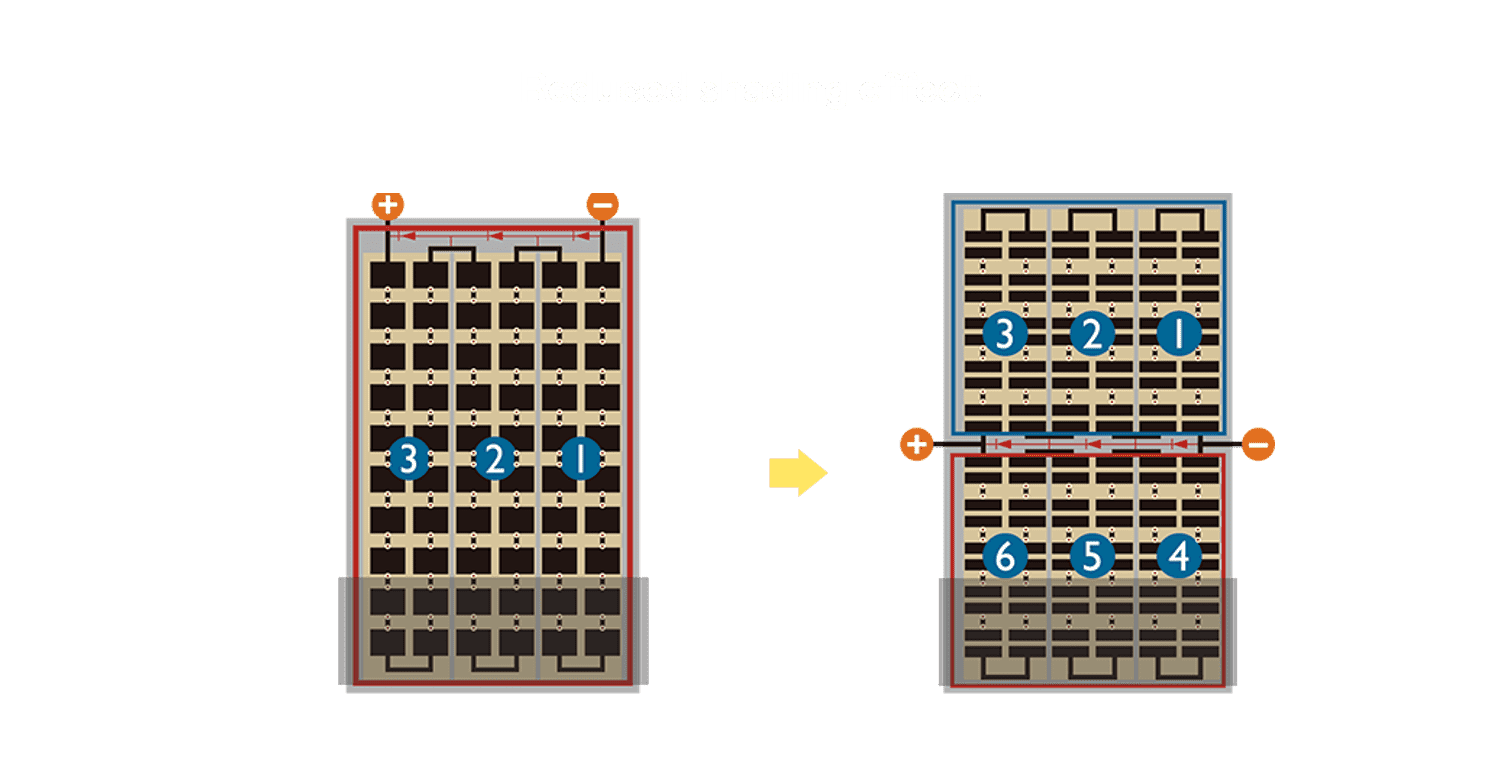- 结合半切电池,,,,降低遮阴影响、、、提升模组抗隐裂能力、、并减少电阻损耗,,,进一步提升模组发电效能。。。